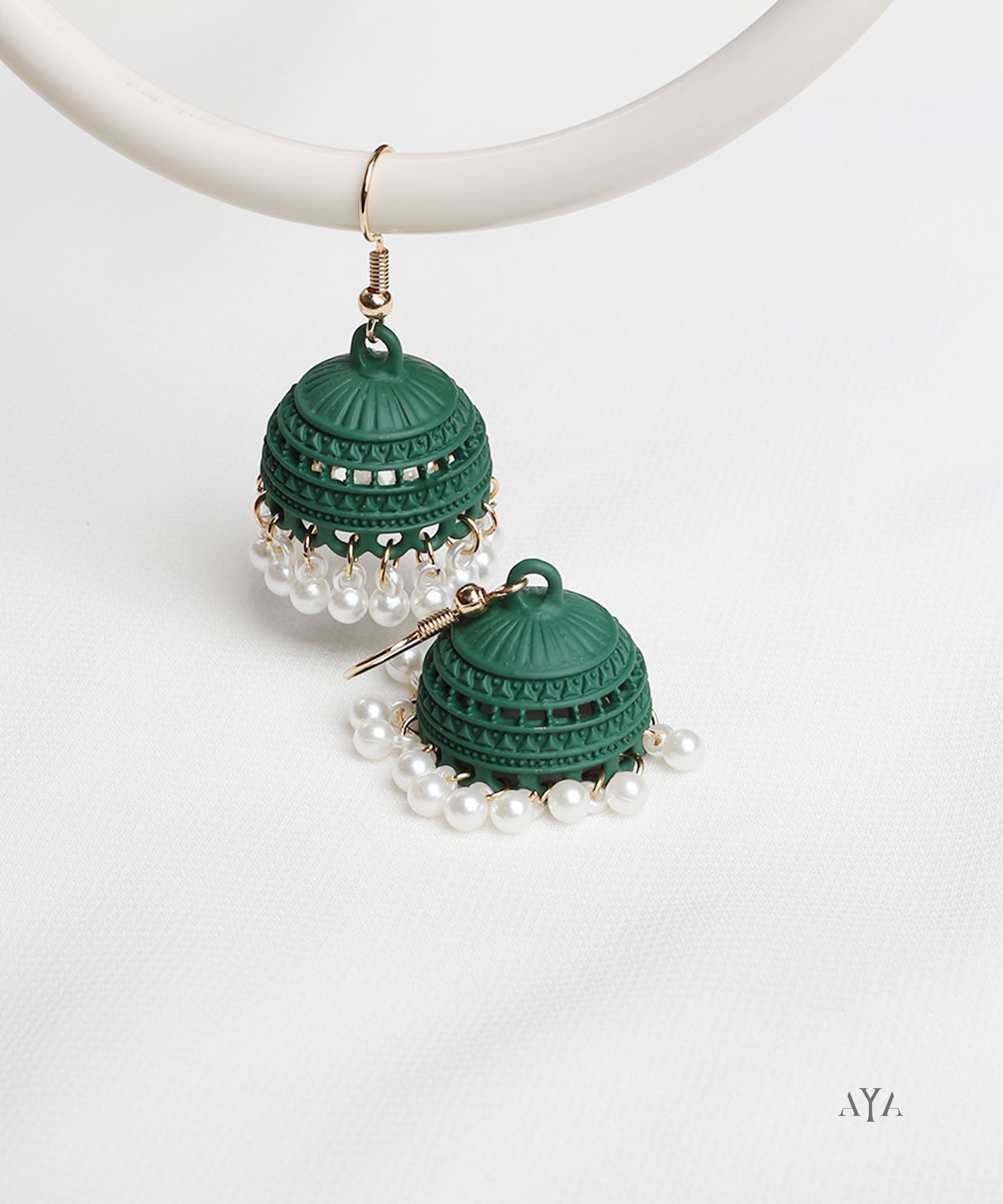 AYA Matte Bottle Green Pearl Dome Jhumka Earrings