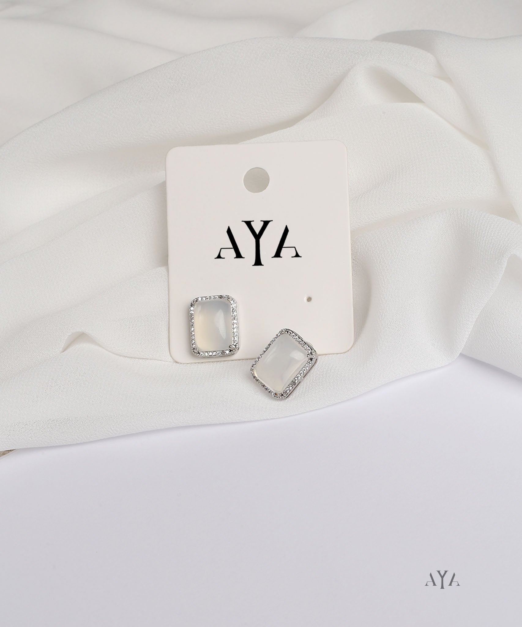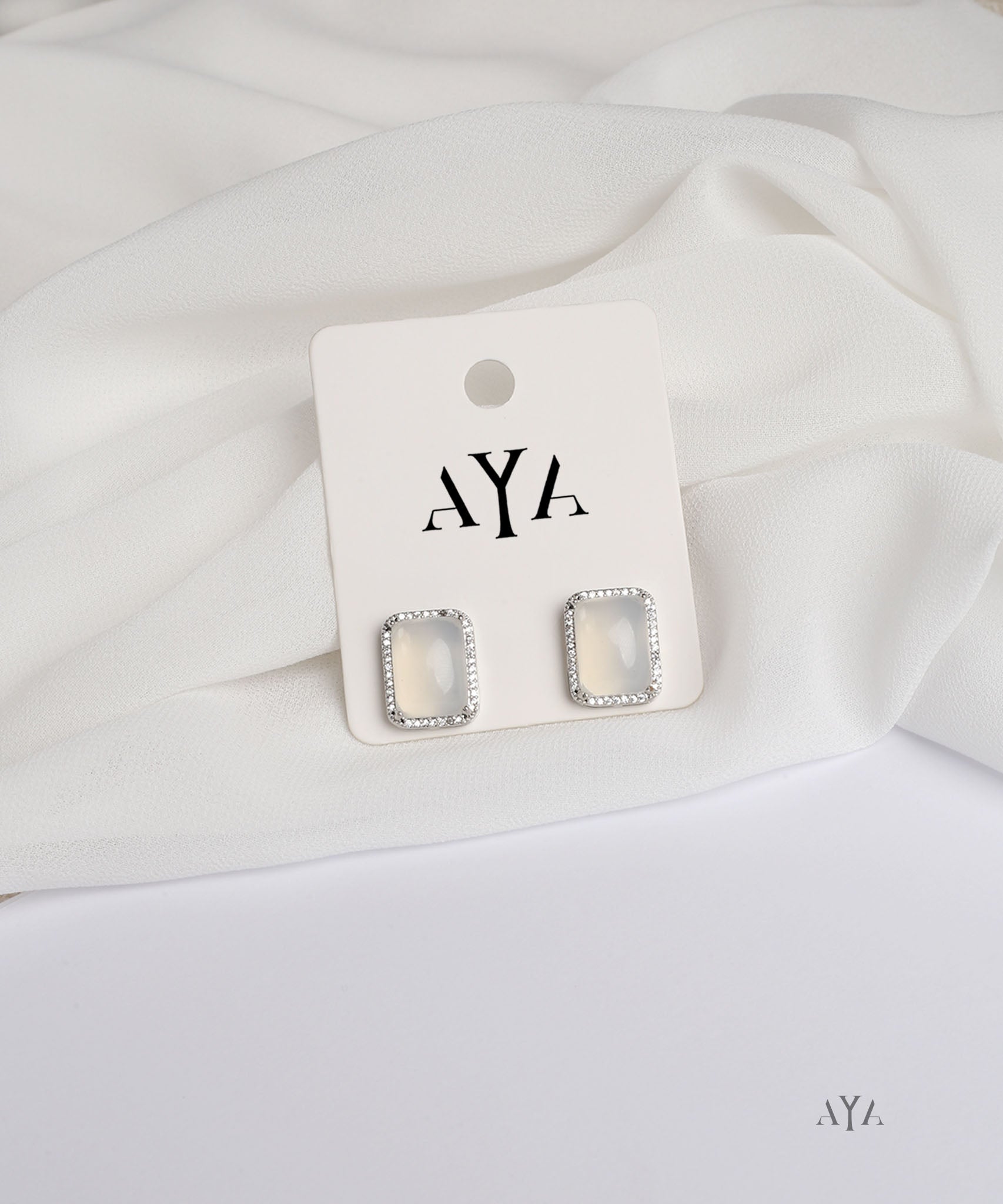 These AYA Milky White Rectangle Stud Earrings feature a milky white quartz stone in a silver-plated frame encrusted with clear pave crystals. Perfect for everyday wear or adding a touch of charm to formal looks.