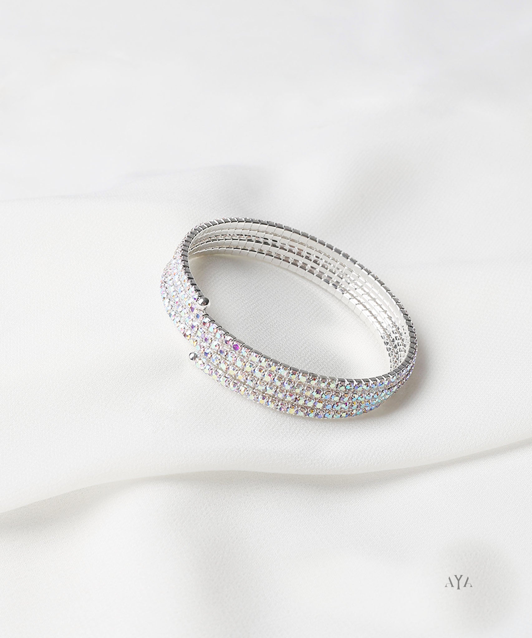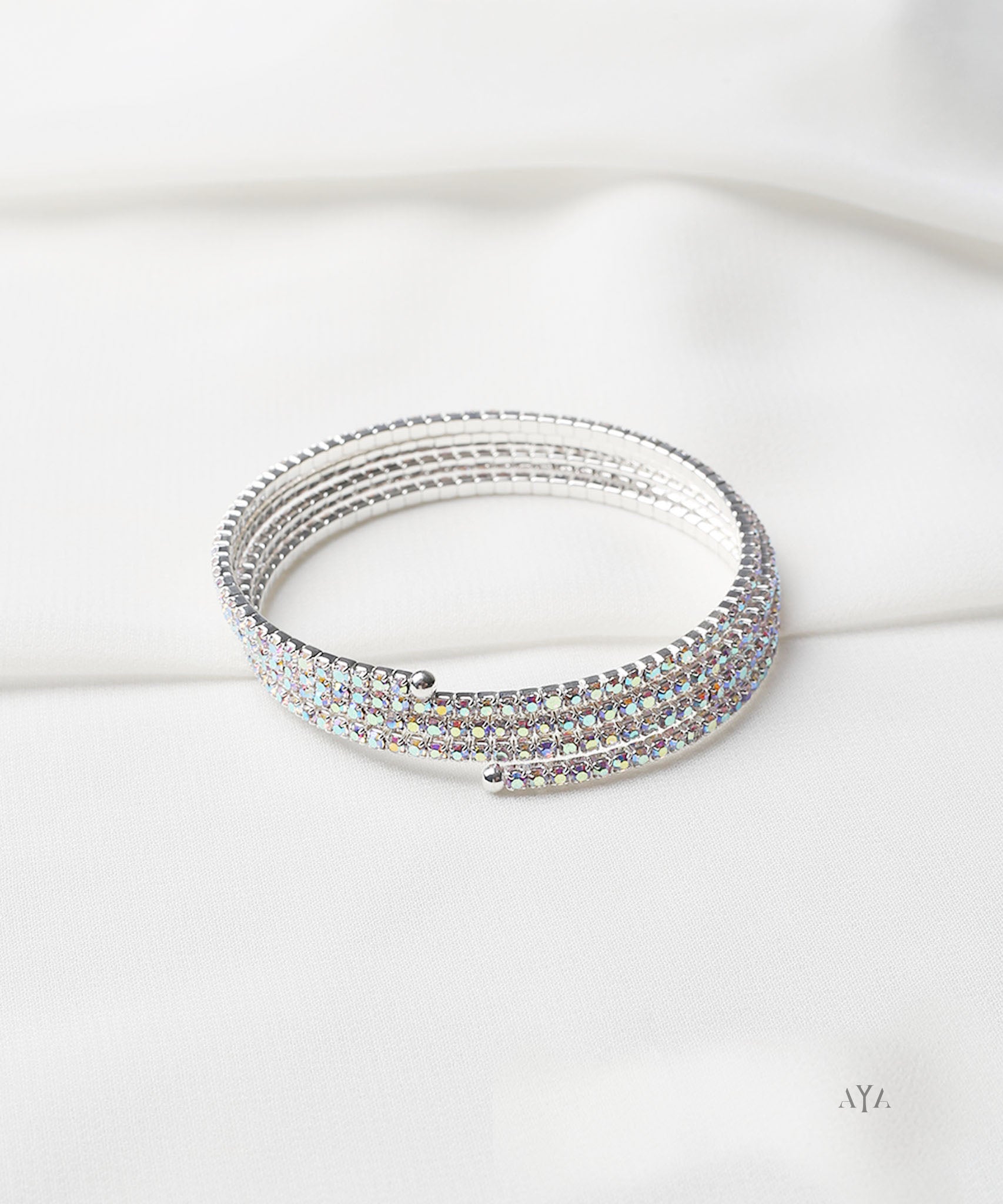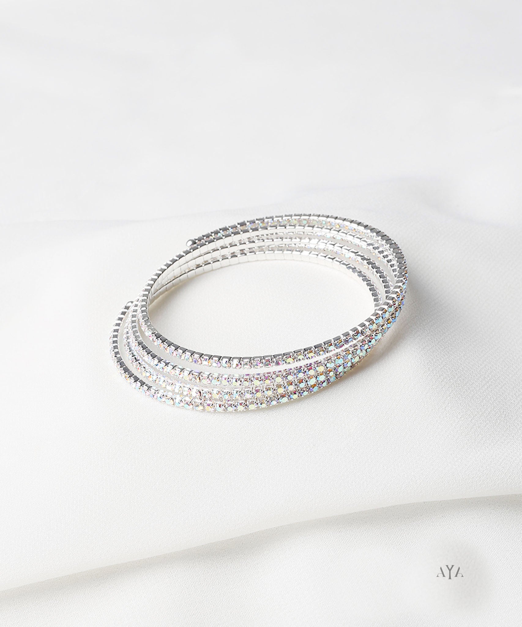This AYA Silver Coil Bangle features Clear Rhinestones that catch the light from every angle. Designed with a flexible wrap style. Lightweight and refined, it’s perfect for formal occasions, evening wear, and festive events.