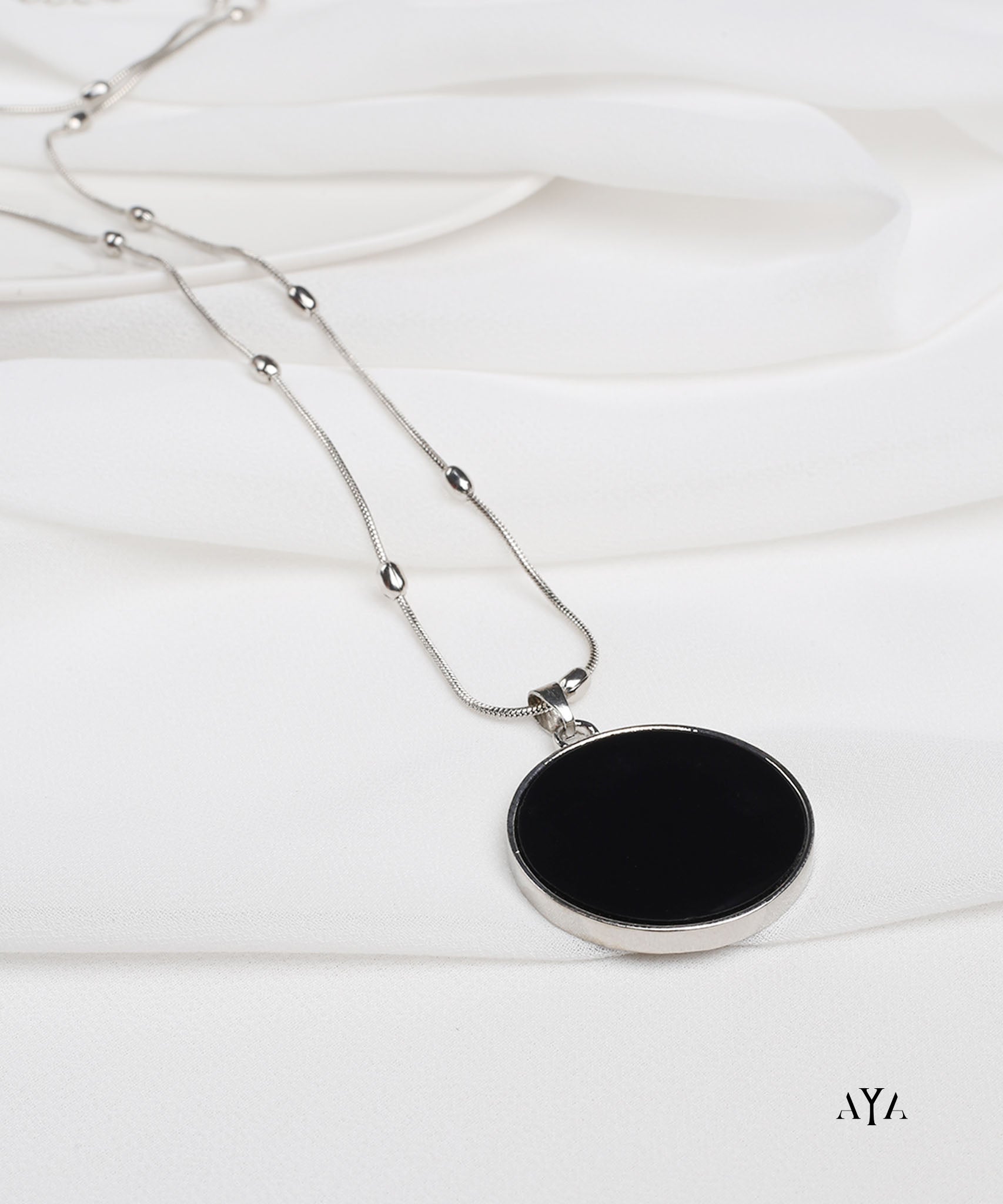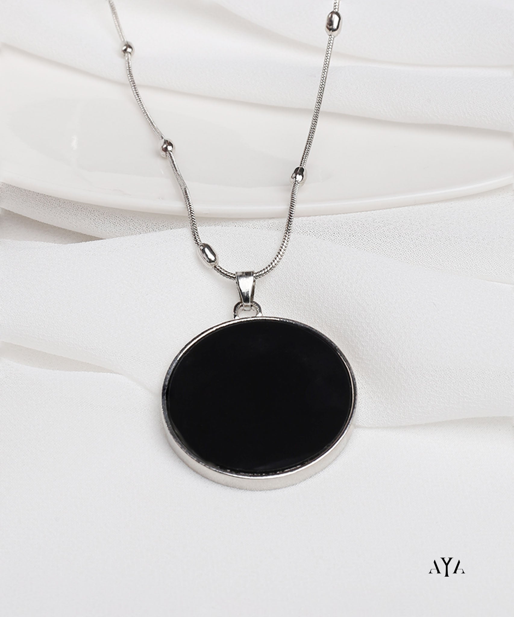 This AYA Silver with Black Coin Necklace features a bold black coin pendant suspended from a silver-toned chain adorned with subtle metallic beads. Perfect for everyday styling or a subtle statement at dinners and semi-formal gatherings.