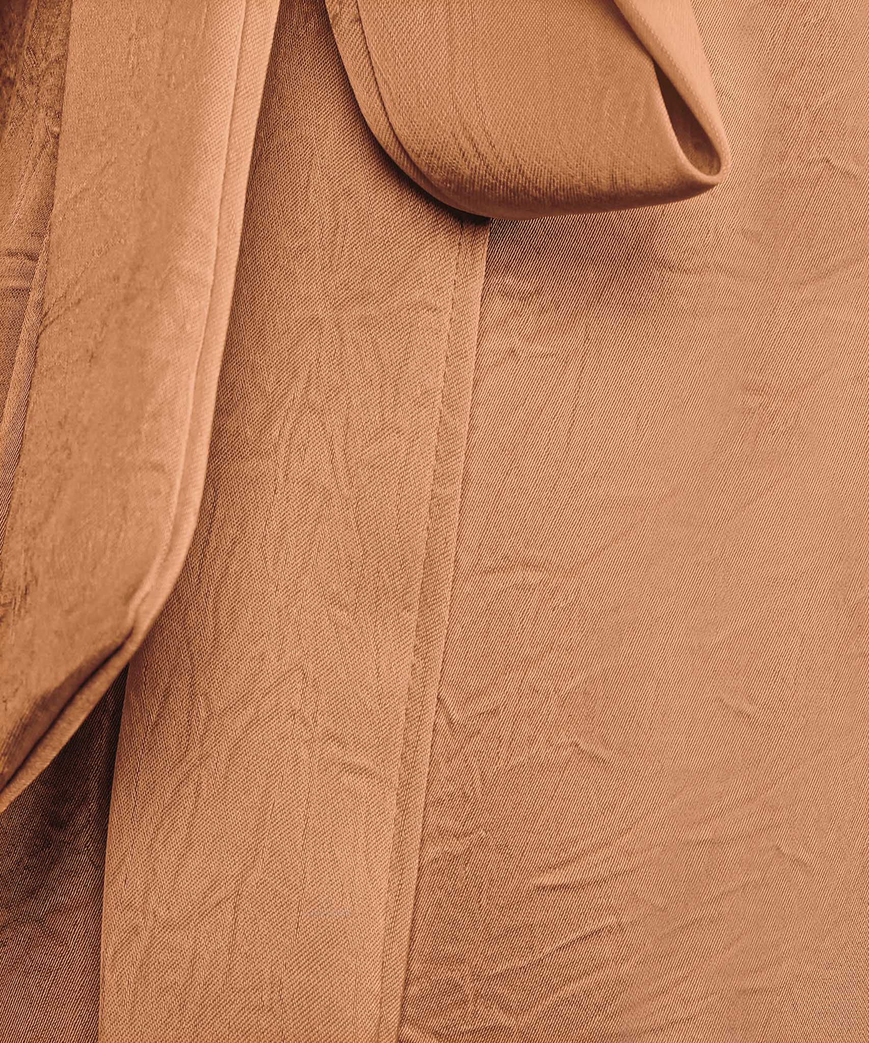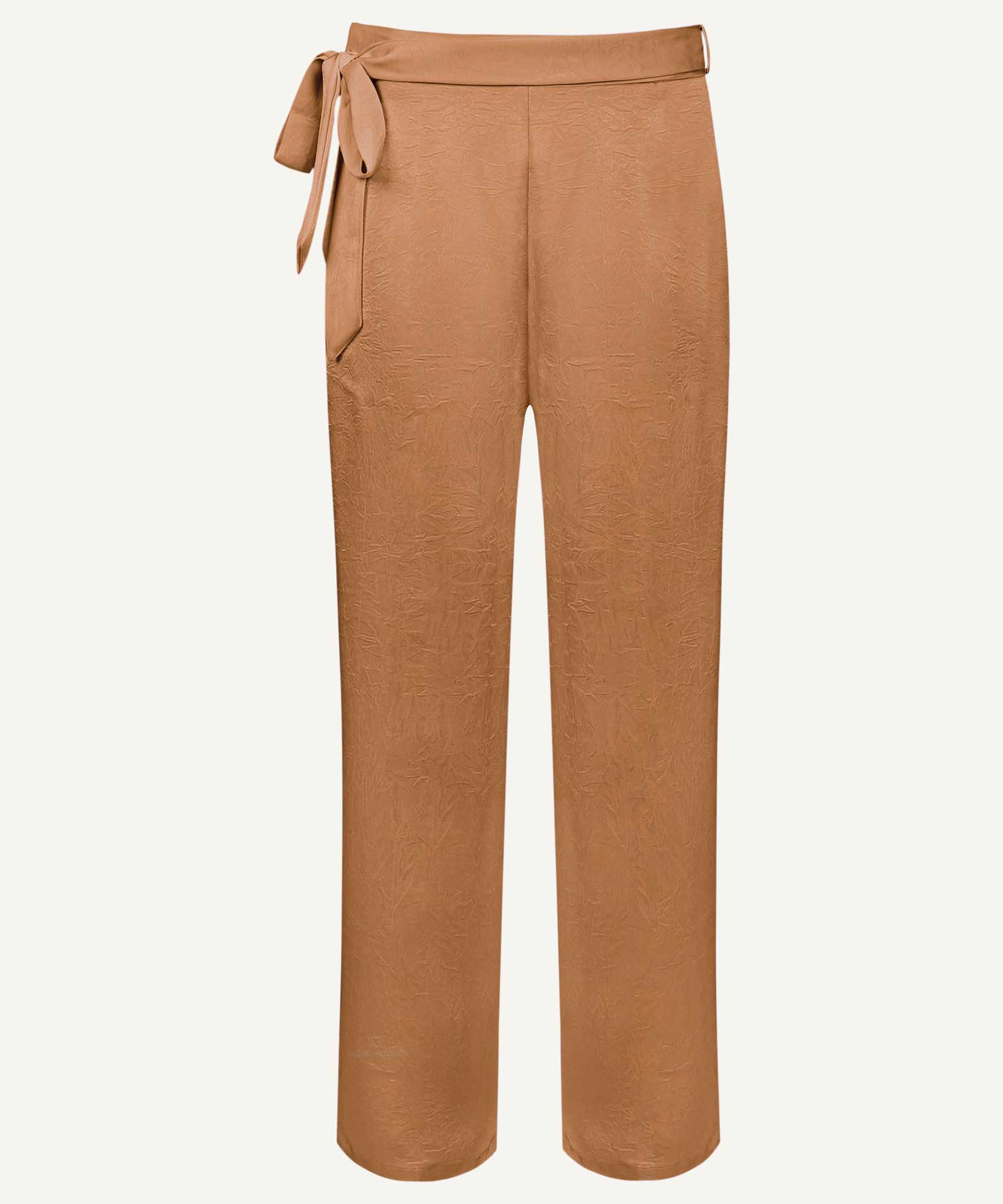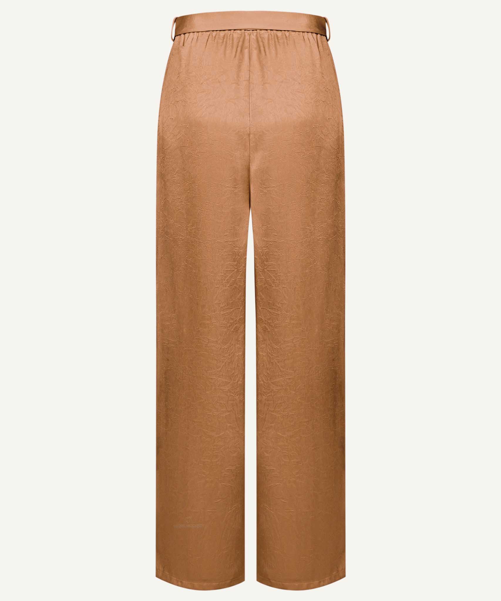 The Dark Tan Satin Wide Legged Pants are crafted from flowy satin fabric, featuring elegantly draped wide legs, a stylish belt, convenient side pockets, and a stretchable waistband for a comfortable fit.