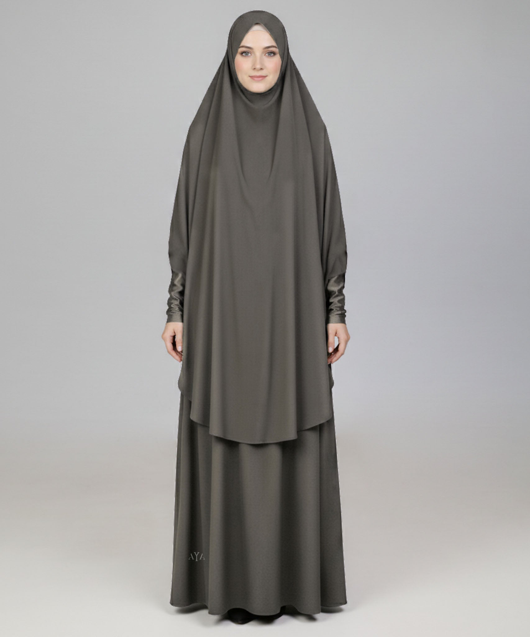 The Grey 2-Piece Prayer Set (Jilbab) offers complete coverage with effortless comfort. Crafted from polyester fabric, it includes a long khimar and a matching wide-cut skirt, creating a graceful drape and a modest silhouette ideal for daily wear, prayer, or travel.