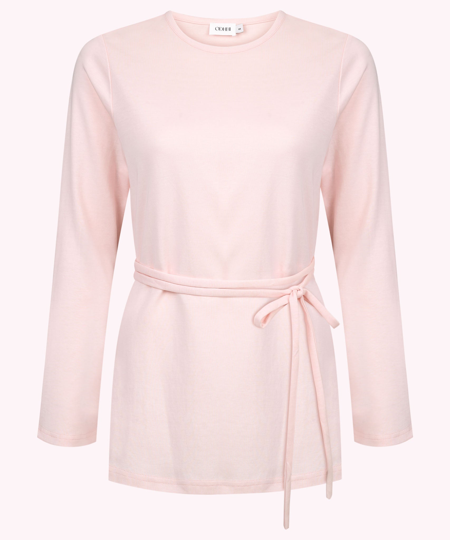 This Iced Pink Belted Tee is designed in a short, tailored fit with a round neckline and long, slightly flared sleeves. It features a matching fabric belt that defines the waist for a neat, structured look. Made from a soft, opaque jersey fabric, this tee offers comfort and coverage for everyday wear.