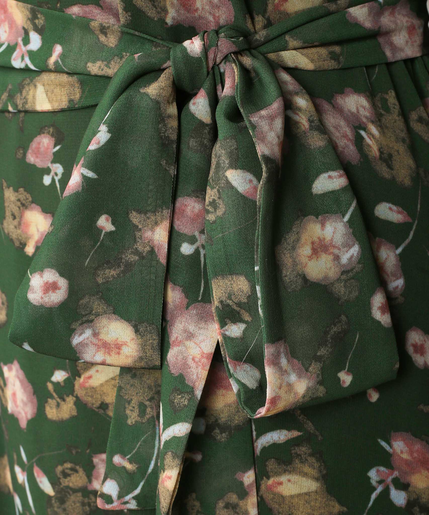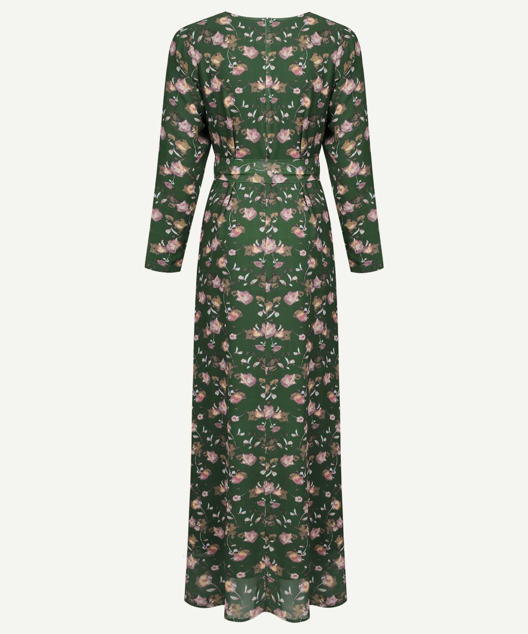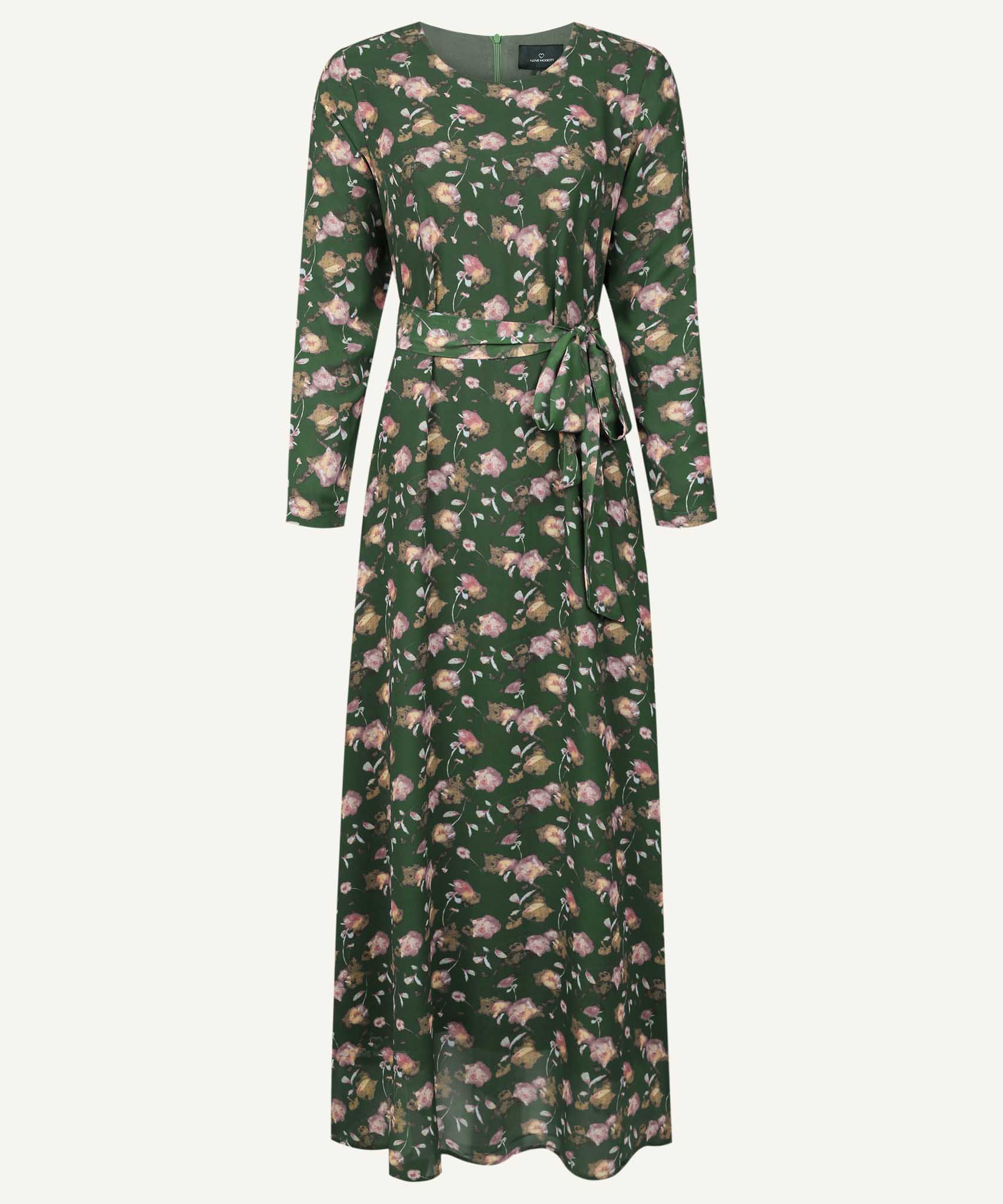 Painterly Rose Print Chiffon Classic A-Line Long Sleeve Maxi Abaya Dress